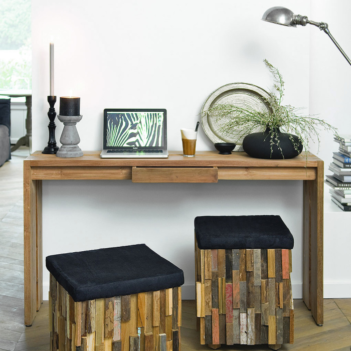 Сам по себе консольный столик выглядит достаточно живописно. Но почему бы не сделать его изюминкой интерьера гостиной? Для этого поставьте рядом с консольным столиком необычные стулья, на него – вертикальный декор, а на стену повесьте несколько картин в хаотичном порядке. Завершающий штрих – светильник, позволяющий гостям насладиться этой декоративной композицией даже в темное время суток.